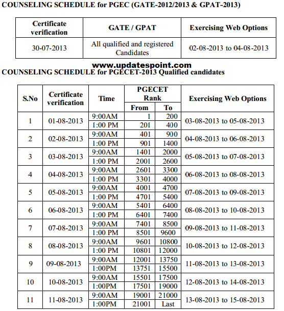 PGECET 2013 Counseling details and schedule for certificates verification can download at appgect.org…..
