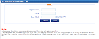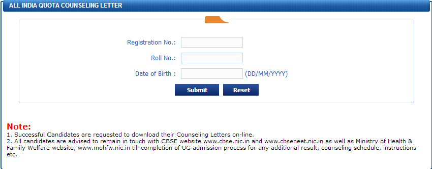The counseling procedure for this examination can be found in the official website of NEET-UG 2013 once released. The counseling letter for the candidates under all india quota can be downloaded in the official with the link as given below. The candidates who are qualified in this examination are only requested to download their counseling letters on-line. These counseling letters are only for the 15% of the candidates who are in all india quota.